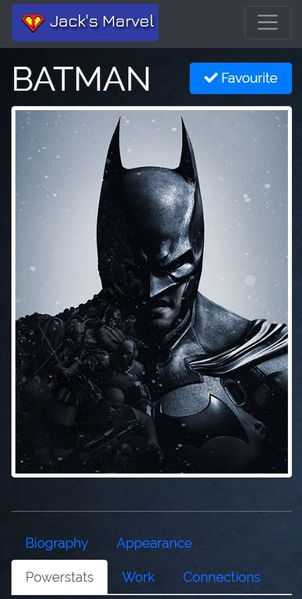 Project Details: Get all marvellous Comic Super Heroes and Villians from all universes. Explore Powerstats, Biography, Appearance, Work, Connections and Images of all your favourite characters.